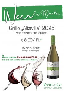 Im März 2026 ist es der Grillo Altavilla DOC 2025 von Firriato (Sizilien) zum Preis von € 8,90/Fl. (sonst 10,90)
