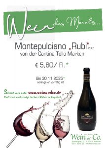 Im November 2025 ist es der Rubi Montepulciano DOP 2021 von der Cantina Tollo aus Abruzzo zum Preis von € 5,60/Fl. (sonst 7,20)